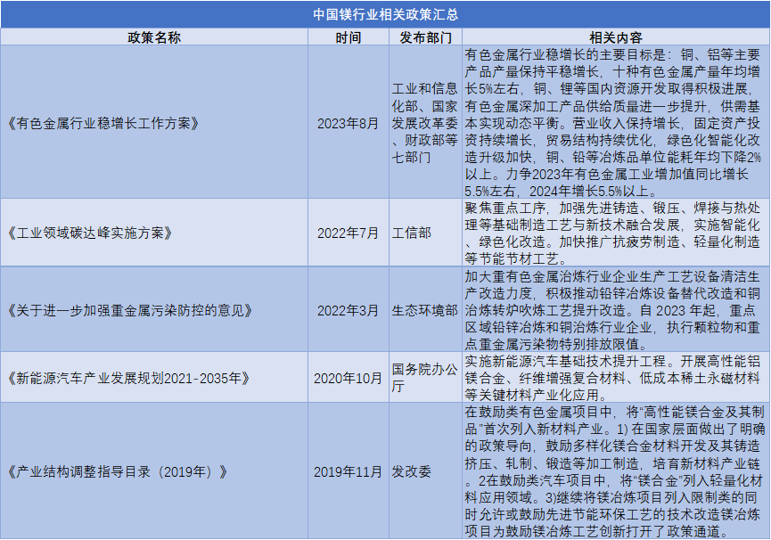 鎂合金產(chǎn)業(yè)作為國(guó)家戰(zhàn)略新興產(chǎn)業(yè),受到國(guó)家高度重視,“十三五”規(guī)劃中明確指出推進(jìn)鎂合金材料在汽車領(lǐng)域的規(guī)模應(yīng)用。此外,鎂行業(yè)中的眾多高新技術(shù)企業(yè)、小微企業(yè),可享受低稅率等政策優(yōu)惠。2022年工信部發(fā)布《工業(yè)領(lǐng)域碳達(dá)峰實(shí)施方案》,提出聚焦重點(diǎn)工序,加強(qiáng)先進(jìn)鑄造、鍛壓、焊接與熱處理等基礎(chǔ)制造工藝與新技術(shù)融合發(fā)展,實(shí)施智能化、綠色化改造。加快推廣抗疲勞制造、輕量化制造等節(jié)能節(jié)材工藝。在眾多輕量化材料中,鎂合金的輕量化效果最好。鎂合金的減重效果優(yōu)于鋁合金,其比強(qiáng)度高于鋁合金和鋼,其比剛度與鋁合金和鋼相當(dāng),減振性、磁屏蔽性遠(yuǎn)優(yōu)于鋁合金。