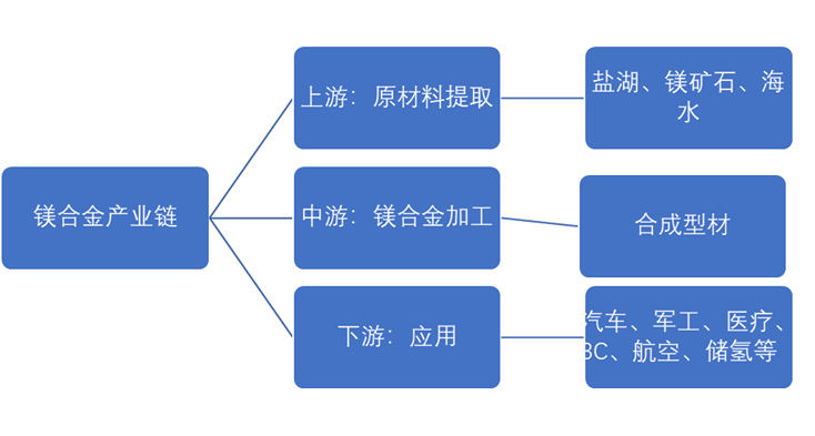 鎂產(chǎn)業(yè)鏈包含上游提煉、中游鑄造塑性及下游深加工。上游提煉主要包括鎂礦石的分離、 提煉,海水鹽湖提煉等,從含有鎂元素菱鎂礦、白云石等提煉出原鎂;中游鑄造塑性是將原 鎂轉(zhuǎn)化為鎂合金,再對(duì)鎂合金通過鑄造和變形的成型工藝以生產(chǎn)鎂合金合成型材與鑄件;下 游產(chǎn)業(yè)通過壓鑄對(duì)鎂合金進(jìn)行深加工,形成能滿足下游特殊性能需求的鎂合金系列材料。