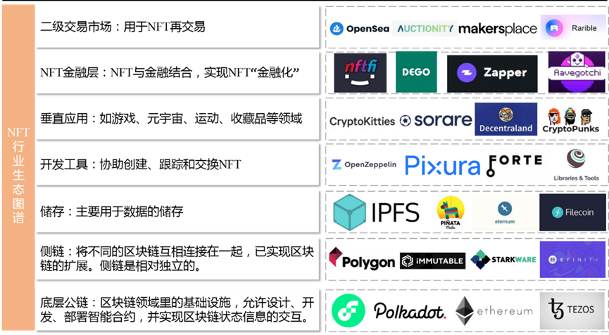底層公鏈、側(cè)鏈、儲存、開發(fā)工具作為基礎(chǔ)設(shè)施層協(xié)助NFT平臺的建立與應(yīng)用;由基礎(chǔ)設(shè)施層衍生出垂直應(yīng)用、NFT金融層以及二級交易市場等前端應(yīng)用。