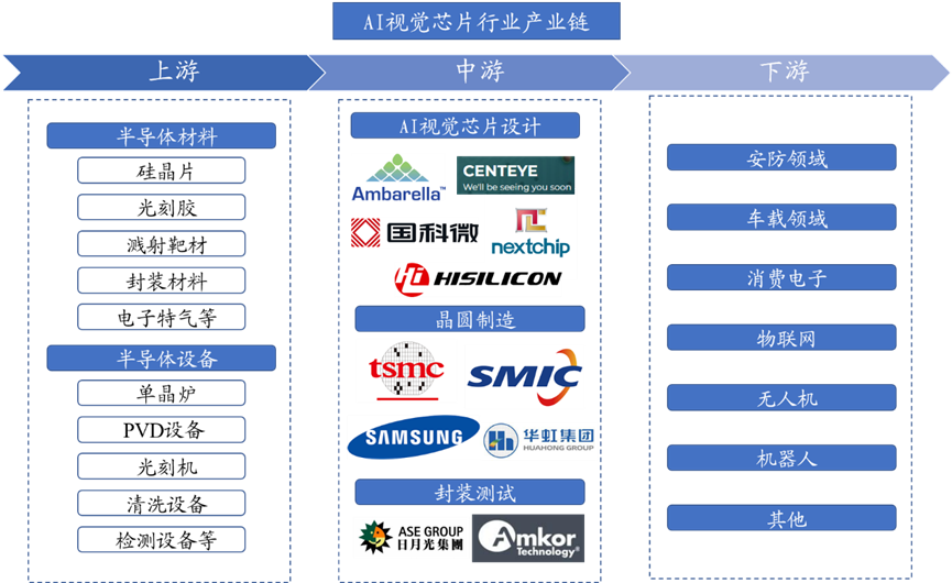 AI視覺芯片產(chǎn)業(yè)鏈上游包括各類半導(dǎo)體材料和半導(dǎo)體設(shè)備;中游為AI視覺芯片制造過程,包括芯片設(shè)計、晶圓制造、封裝測試;下游廣泛應(yīng)用于安防、汽車、智能家居、物聯(lián)網(wǎng)、無人機(jī)、機(jī)器人等領(lǐng)域。