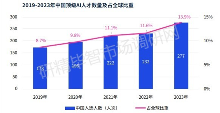 圖表 3 2019-2023年中國頂級AI人才數(shù)量及占全球比重