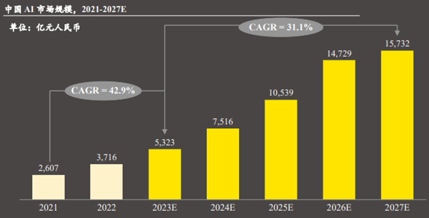 行業(yè)大模型要針對(duì)特定行業(yè)的具體需求,提供更加精細(xì)和個(gè)性化的解決方案,才是成為能夠滿足各個(gè)行業(yè)創(chuàng)新式發(fā)展的“Killer App”,也將是AI大模型行業(yè)在企業(yè)級(jí)市場(chǎng)實(shí)現(xiàn)發(fā)展的重要方向。根據(jù)市場(chǎng)調(diào)研的數(shù)據(jù)顯示,2022年中國(guó)人工智能行業(yè)市場(chǎng)規(guī)模為3,716億人民幣,預(yù)計(jì)2027年將達(dá)到15,372億人民幣,有望在下游金融制造、交通、醫(yī)療等多領(lǐng)域不斷滲透,實(shí)現(xiàn)大規(guī)模落地應(yīng)用。