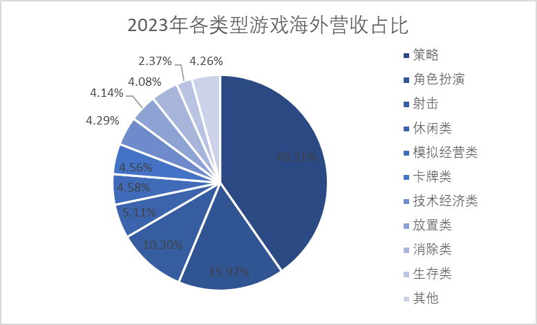 出海收入前100位自研移動游戲中,策略類占比40.31%,角色扮演類占比15.97%;射擊和休閑類占比分別為10.03%和5.11%。策略類近三年一直是海外營收主力,前三位合計營收占比從去年63.87%,增至今年66.31%;射擊類占比有所下降;休閑類占比增長明顯。