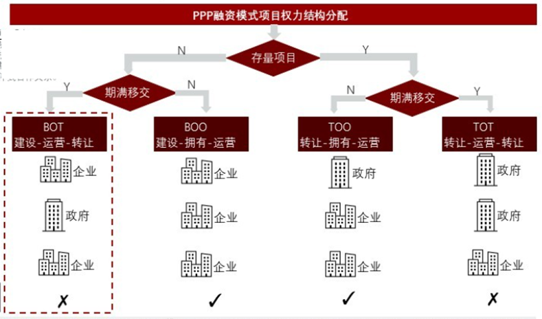 首先,政府針對具體項(xiàng)目特許新建一家項(xiàng)目公司,并對其提供扶持措施,然后由項(xiàng)目公司負(fù)責(zé)進(jìn)行項(xiàng)目的融資和建設(shè)。項(xiàng)目建成后,由政府特許企業(yè)進(jìn)行項(xiàng)目的開發(fā)和運(yùn)營。根據(jù)政府對不同項(xiàng)目建設(shè)權(quán)和控制權(quán)的歸屬要求,PPP項(xiàng)目又分化出了BOT、BOO、TOO、TOT等多種模式。