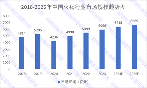 除2020年受疫情影響外,火鍋行業(yè)一直保持穩(wěn)定增長態(tài)勢。火鍋口味多元、社交屬性強,相比其他餐飲品類,火鍋餐飲行業(yè)更容易實現(xiàn)規(guī)?;?、標準化。根據(jù)市場調(diào)研數(shù)據(jù)顯示,2023年中國火鍋行業(yè)市場規(guī)模達到5966億元,預計2024年市場規(guī)模將繼續(xù)增長,突破6000億元。