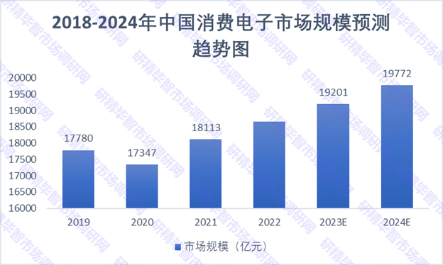 根據(jù)市場(chǎng)調(diào)研數(shù)據(jù)顯示,2022年中國(guó)消費(fèi)電子市場(chǎng)規(guī)模達(dá)到近19000億元,近五年年均復(fù)合增長(zhǎng)率為2.97%。預(yù)計(jì)2023年中國(guó)消費(fèi)電子市場(chǎng)規(guī)模將增至19201億元,2024年將達(dá)到19772億元。