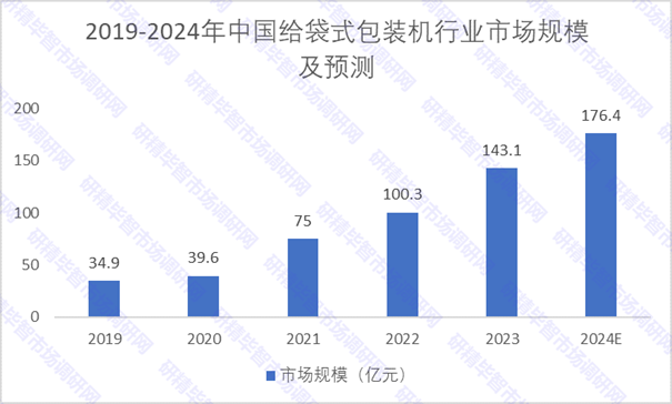 根據(jù)研究報告顯示,中國給袋式包裝機行業(yè)市場規(guī)模由2019年的34.9億元增長至2023年的143.1億元,年均復合增長率達42.3%;預計2028年整體市場規(guī)模有望增長至370.7億元,2024年至2028年年均復合增長率達20.4%。其中給袋式真空包裝機市場規(guī)模在總體市場中占比較大。