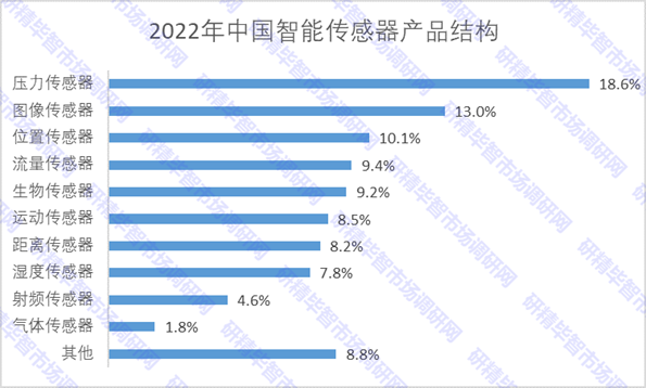我國(guó)智能傳感器細(xì)分品類眾多,可按照檢測(cè)對(duì)象、工作原理、測(cè)量方式、作用形式、輸出信號(hào)等方式進(jìn)行分類。從產(chǎn)品結(jié)構(gòu)來(lái)看,2022年壓力傳感器占比最高的,市場(chǎng)份額達(dá)到18.6%;圖像傳感器、位置傳感器分列二、三位,分別占比13%和10.1%;射頻傳感器和氣體傳感器占比較少,分別為4.6%和1.8%。