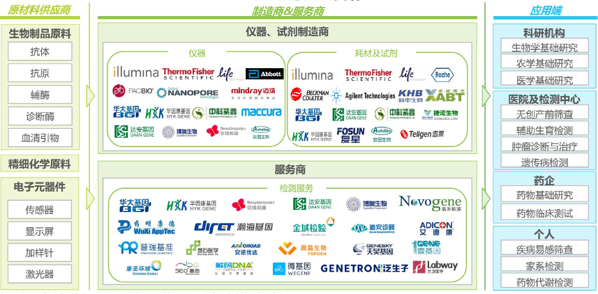 IVD產(chǎn)業(yè)鏈由上游原材料供應(yīng)商、中游制造商和服務(wù)商、下游需求方(即應(yīng)用端)組成。上游部分,診斷酶、抗原和抗體是IVD產(chǎn)品的主要原料,技術(shù)壁壘高,質(zhì)量直接影響IVD試劑質(zhì)量和穩(wěn)定性,目前國產(chǎn)率較低。中游部分,主要負(fù)責(zé)ID產(chǎn)品的研發(fā)、制造和質(zhì)控,包括儀器、耗材和試劑的制造商以及提供ivd檢測服務(wù)的服務(wù)商,在產(chǎn)業(yè)鏈中價值最高,還會存在一小部分的分銷商,主要負(fù)責(zé)將IVD產(chǎn)品從制造商銷售和運(yùn)輸?shù)叫枨蠓?。下游部分,主要是使用IVD產(chǎn)品進(jìn)行測試的機(jī)構(gòu)和個人,包括醫(yī)院、第三方實驗室等。