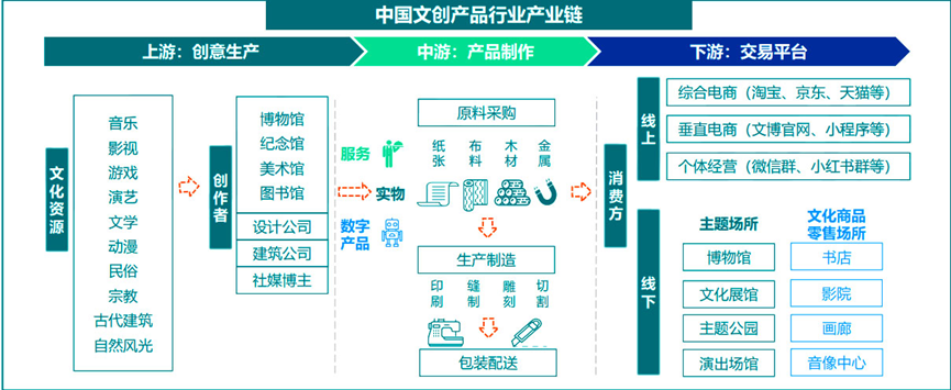 產(chǎn)業(yè)鏈上游為創(chuàng)意生產(chǎn),博物館、美術館、設計公司、社媒博主等創(chuàng)作者利用文化資源生產(chǎn)文創(chuàng)實物、數(shù)字產(chǎn)品,中游為產(chǎn)品制作,涉及到原料采購、生產(chǎn)制造和包裝制造環(huán)節(jié),下游為交易平臺。