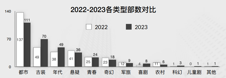 古裝劇作為常?賽道,2023年進(jìn)?步升溫,爆款多、影響?持續(xù)?漲,其“現(xiàn)實之外造夢”的特征也迎合了?眾對情緒價值和娛樂性的觀劇需求。都市劇播出數(shù)?最多,但因缺乏新意難出爆款,年平均景?僅0.95,2023年疲態(tài)難掩;年代劇在共同記憶回溯加持下?強(qiáng),?春劇有少?驚喜;科幻劇貢獻(xiàn)頭部?劇《三體》表現(xiàn)驚艷。