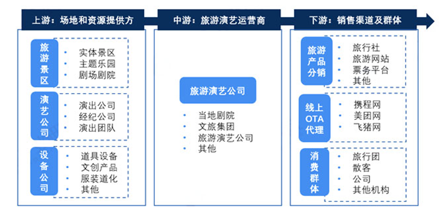 旅游演藝行業(yè)的產(chǎn)業(yè)鏈可以分為上游的內(nèi)容創(chuàng)作與制作、中游的運(yùn)營與管理以及下游的市場推廣與銷售三個(gè)主要環(huán)節(jié)。內(nèi)容創(chuàng)作與制作包括劇本編寫、舞臺設(shè)計(jì)、服裝道具制作等;運(yùn)營與管理涉及演員培訓(xùn)、排練、演出組織等;市場推廣與銷售則包括票務(wù)管理、客戶服務(wù)、品牌建設(shè)等。此外,產(chǎn)業(yè)鏈還涉及到場館建設(shè)、技術(shù)支持、保險(xiǎn)金融等相關(guān)服務(wù)。