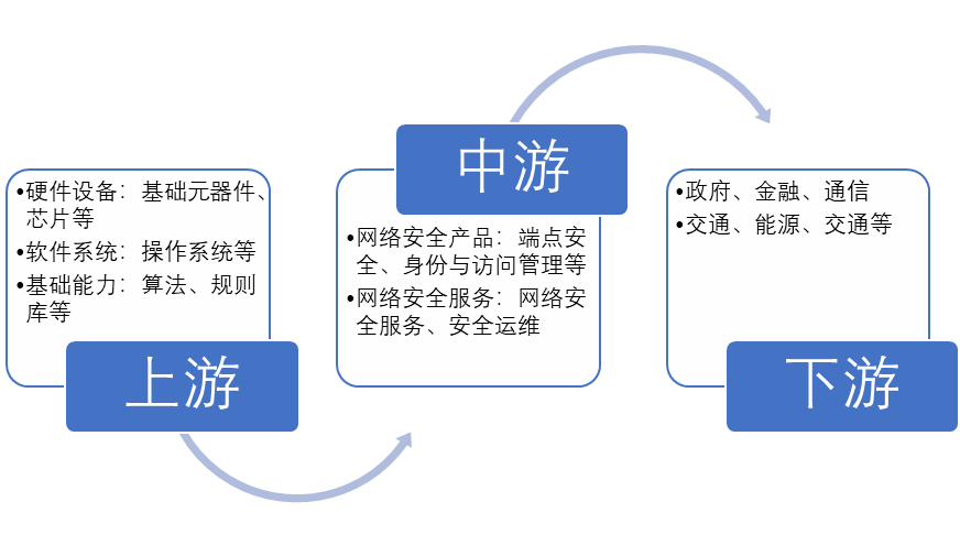 網(wǎng)絡(luò)安全產(chǎn)業(yè)鏈上游主要是信息技術(shù)軟硬件產(chǎn)品和信息技術(shù)服務(wù)供應(yīng)商;中游分為網(wǎng)絡(luò)安全產(chǎn)品和服務(wù),網(wǎng)絡(luò)安全產(chǎn)品包括網(wǎng)絡(luò)與基礎(chǔ)架構(gòu)安全、端點安全、身份與訪問管理等七類,網(wǎng)絡(luò)安全服務(wù)包括安全方案與集成、安全運維、風險評估等九類;下游應(yīng)用于政府、能源、金融、通信、交通、教育、衛(wèi)生、國防等領(lǐng)域。