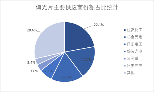 近年來(lái),偏光片企業(yè)不斷擴(kuò)大產(chǎn)能、偏光片投融資向好。從企業(yè)市場(chǎng)規(guī)模占比來(lái)看,住友化工市場(chǎng)份額占比最高,達(dá)22.1%。其次,本土企業(yè)杉金光電積極建設(shè)全球領(lǐng)先的偏光片產(chǎn)線(xiàn),市場(chǎng)份額占比達(dá)17.7%。日東電工、盛波光電、三利譜、恒美光電占比分別為17.5%、7.1%、3.6%、3.4%。