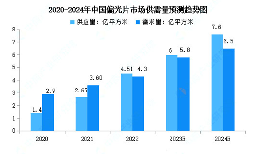 我國(guó)是偏光片產(chǎn)銷(xiāo)大國(guó),市場(chǎng)需求量巨大。根據(jù)市場(chǎng)調(diào)研數(shù)據(jù)顯示,2022年中國(guó)偏光片供應(yīng)量為4.51億平方米,同比增長(zhǎng)70.2%;偏光片需求量為4.3億平方米,同比增長(zhǎng)19.4%。行業(yè)研究報(bào)告預(yù)測(cè),2024年我國(guó)偏光片供應(yīng)量和需求量將分別增至7.6億平方米、6.5億平方米。