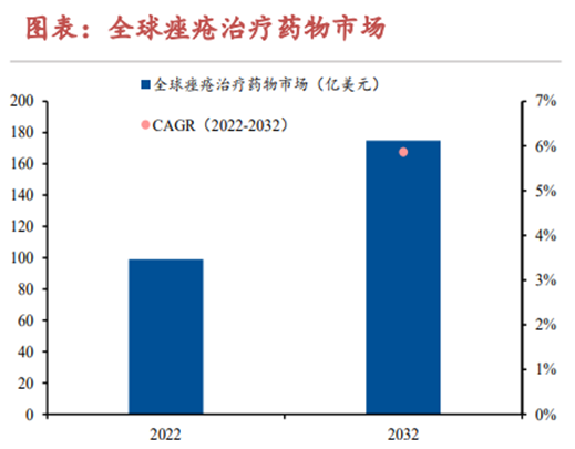 海外痤瘡新藥接連上市,全球痤瘡藥物市場(chǎng)預(yù)計(jì)將在未來穩(wěn)定增長(zhǎng)。近年來海外企業(yè)相繼向市場(chǎng)推出多款新產(chǎn)品,療效好的產(chǎn)品擁有較高的終端定價(jià)。研究報(bào)告指出,全球痤瘡治療藥物市場(chǎng)將從2022年的99億美元增長(zhǎng)至2032年的175億美元,CAGR達(dá)5.86%,全球痤瘡治療藥物市場(chǎng)將在新產(chǎn)品滲透率提升的作用下穩(wěn)步擴(kuò)張。