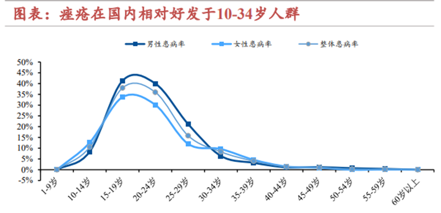 根據(jù)市場(chǎng)調(diào)研數(shù)據(jù)顯示,10-14、15-19、20-24、25-29、30-34歲年齡段中,痤瘡的患病率分別為10.5%、38.0%、36.0%、15.8%、8.3%,高于整體患病率8.1%;在成年人遲發(fā)型痤瘡、成年人持續(xù)型痤瘡、青少年痤瘡中,中度及重度占比分別為21.1%及1.8%、28.4%及6.7%、25.6%及5.5%,在各類型痤瘡中截面占比約三成。