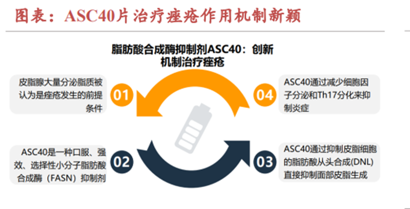 研究報(bào)告指出,2023年1月,歌禮制藥宣布啟動(dòng)口服脂肪酸合成酶抑制劑ASC40片治療中/重度尋常性痤瘡的III期臨床試驗(yàn)完成首例給藥,復(fù)旦大學(xué)附屬華山醫(yī)院項(xiàng)蕾紅教授擔(dān)任這項(xiàng)III期臨床試驗(yàn)的主要研究者。除痤瘡以外,ASC40片還有NASH、復(fù)發(fā)膠質(zhì)瘤適應(yīng)癥相關(guān)臨床試驗(yàn)在同步推進(jìn)中,該品種的安全性有望被逐步佐證。