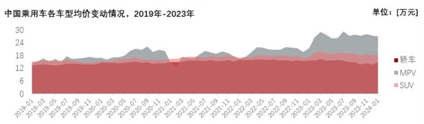 研究報告顯示,2023年,轎車、SUV、MPV車型的銷售冠軍車型的入門價格分別為7.86萬元、25.89萬元、23.29萬元。而從均價情況來看,轎車、SUV、MPV車型的數(shù)據(jù)分別為15.18萬元、18.77萬元、27.01萬元。SUV和MPV由于其更大的尺寸、更復雜的驅(qū)動系統(tǒng)、以及更高的性能要求,其生產(chǎn)成本普遍高于轎車。但從橫向變動情況來看,在自動駕駛和新能源的價值量加持下,各車型的均價都隨著時間的推移上升了,轎車車型的均價已經(jīng)從2019年的13.79萬元增長至15.18萬元。
