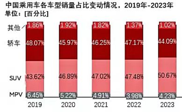根據(jù)市場調(diào)研發(fā)現(xiàn),2019年,轎車在乘用車市場銷售總量的占比達到了48.07%,但到2023年已下降至44.09%。相對的,SUV的占比從43.62%增長至60.67%。