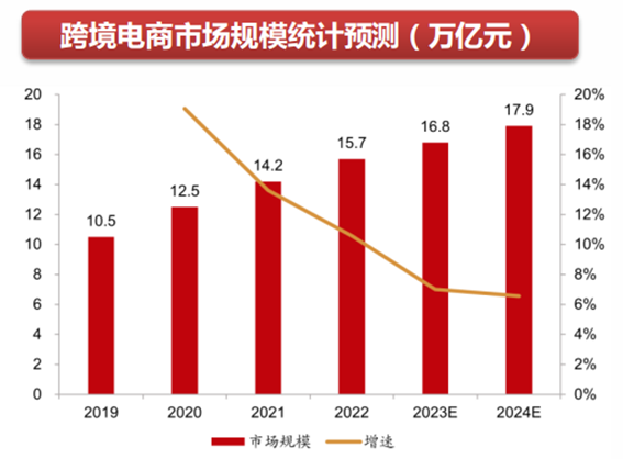 跨境電商的興起打破了傳統(tǒng)外貿(mào)的渠道壁壘,出口企業(yè)得以直面海外消費者。據(jù)市場調(diào)研統(tǒng)計,近年來,我國跨境電商蓬勃發(fā)展,預(yù)計2023年國內(nèi)跨境電商市場規(guī)模將達(dá)16.8萬億元,2024年將達(dá)17.9萬億元。