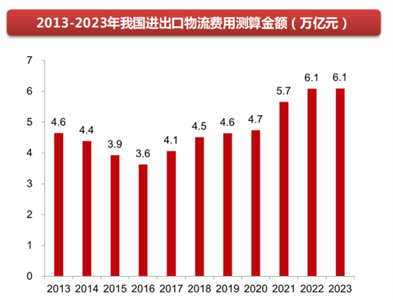 按照2021中國物流總費用占GDP比重14.6%估算,結(jié)合2023年我國進出口總值41.76萬億元人民幣,行業(yè)研究報告預(yù)計2023 年我國進出口規(guī)模對應(yīng)的物流費用約6.1萬億元。