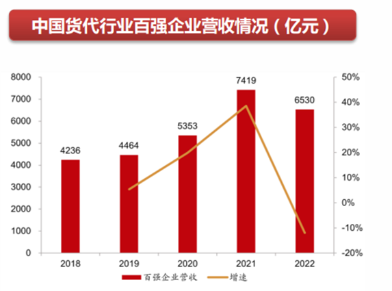 近年來隨著中國“一帶一路”戰(zhàn)略的實施,自貿(mào)區(qū)的建立及國際貿(mào)易相關(guān)利好政策不斷出臺,我國國際貨代行業(yè)相關(guān)企業(yè)營收大幅增長。市場調(diào)研數(shù)據(jù)顯示2022年我國國際貨代百強企業(yè)營收從2018年的4235.9億元增長至2022年的6530.1億元。 而2022年海運前50企業(yè)總營業(yè)額3064.6億元,同比下降10.66%,降幅最為明顯,與集裝箱運價指數(shù)走勢高度一致。