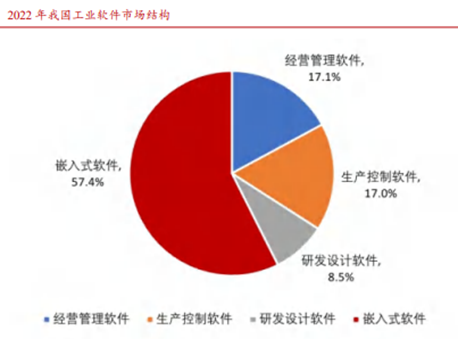 嵌入式軟件占據(jù)市場(chǎng)主導(dǎo)地位,政策推動(dòng)下生產(chǎn)控制、研發(fā)設(shè)計(jì)等環(huán)節(jié)市場(chǎng)規(guī)模占比 有望成長(zhǎng)。從細(xì)分賽道看,目前我國(guó)工業(yè)軟件中嵌入式軟件份額超過(guò)五成,市場(chǎng)調(diào)研數(shù)據(jù)顯示,2022 年占比達(dá)57.4%,研發(fā)設(shè)計(jì)軟件規(guī)模份額僅有8.5%,未來(lái)隨著新型工業(yè)化、新質(zhì)生產(chǎn)力等政策層面的 推動(dòng),疊加工業(yè)企業(yè)在研發(fā)設(shè)計(jì)、生產(chǎn)效率等層面的關(guān)注度提升,研發(fā)設(shè)計(jì)等環(huán)節(jié)的核心工 業(yè)軟件占比有望提升。