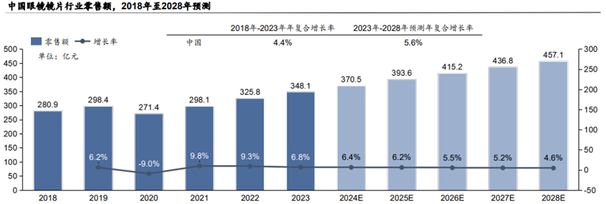 根據(jù)市場(chǎng)調(diào)研數(shù)據(jù),2018年至2023年,中國(guó)眼鏡鏡片行業(yè)零售額從280.9億元增長(zhǎng)至348.1億元,期間的年復(fù)合增長(zhǎng)率到達(dá)4.4%。2020年,線下鏡片零售渠道受疫情沖擊影響,鏡片零售額同比下降9.0%。2021年至2023年,行業(yè)研究報(bào)告顯示鏡片廠商進(jìn)行鏡片產(chǎn)品的開發(fā)迭代,消費(fèi)者對(duì)功能性產(chǎn)品需求增加,同時(shí)線上零售渠道興起,在多方面因素的驅(qū)動(dòng)下,中國(guó)眼鏡鏡片零售額實(shí)現(xiàn)快速增長(zhǎng)。