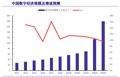 2012 年以來,我國(guó)數(shù)字經(jīng)濟(jì)平均增速15.9%,已連續(xù)11 年顯著高 于GDP 增速,數(shù)字經(jīng)濟(jì)持續(xù)發(fā)揮經(jīng)濟(jì)“穩(wěn)定器”、“加速器”作用。根據(jù)市場(chǎng)調(diào)研數(shù)據(jù)預(yù)測(cè),2023-2035 年中國(guó)數(shù)字經(jīng)濟(jì)占GDP 的比重將持續(xù)提升,2030 年占比達(dá)到59.73%,有望追上發(fā)達(dá)國(guó)家平均水平,預(yù)計(jì)2035 年占比將達(dá)到71.60%。