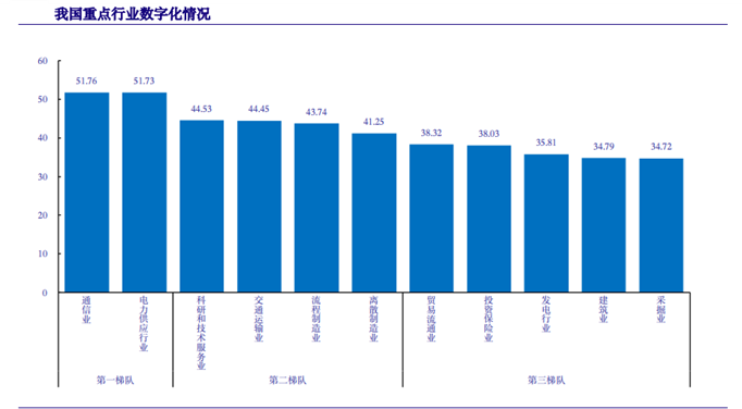 從發(fā)展水平來看,通信、電力供應(yīng)行業(yè)數(shù)字化轉(zhuǎn)型指數(shù)遠(yuǎn)高于國(guó)企平均水平,處于數(shù)字化轉(zhuǎn)型第一梯隊(duì);科硏和技術(shù)服務(wù)業(yè)、交通運(yùn)輸業(yè)、流程制造業(yè)、離散制造業(yè)數(shù)字化轉(zhuǎn)型指數(shù)略高于國(guó)企 平均水平,處于數(shù)字化轉(zhuǎn)型第二梯隊(duì);