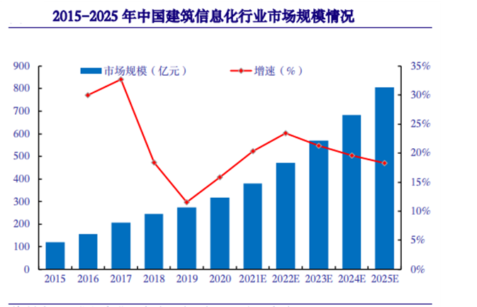 我國(guó)建筑信息化市場(chǎng)規(guī)模逐年上升。據(jù)行業(yè)研究報(bào)告數(shù)據(jù),全球建筑數(shù)字化行業(yè)市場(chǎng)規(guī)模從2015 年的28.13 億美元增長(zhǎng)至2020 年的56.04 億美元,預(yù)計(jì)2026 年市場(chǎng)規(guī)模達(dá)到133億美元,2020-2026 年CAGR在15%左右。我國(guó)建筑信息化行業(yè)市場(chǎng)規(guī)模從2015 年的120 億元增長(zhǎng) 至2021 年的381 億元,隨著滲透率持續(xù)提升,市場(chǎng)規(guī)模將繼續(xù)增長(zhǎng),預(yù)計(jì)2025 年市場(chǎng)規(guī)模達(dá)到806.8 億元。