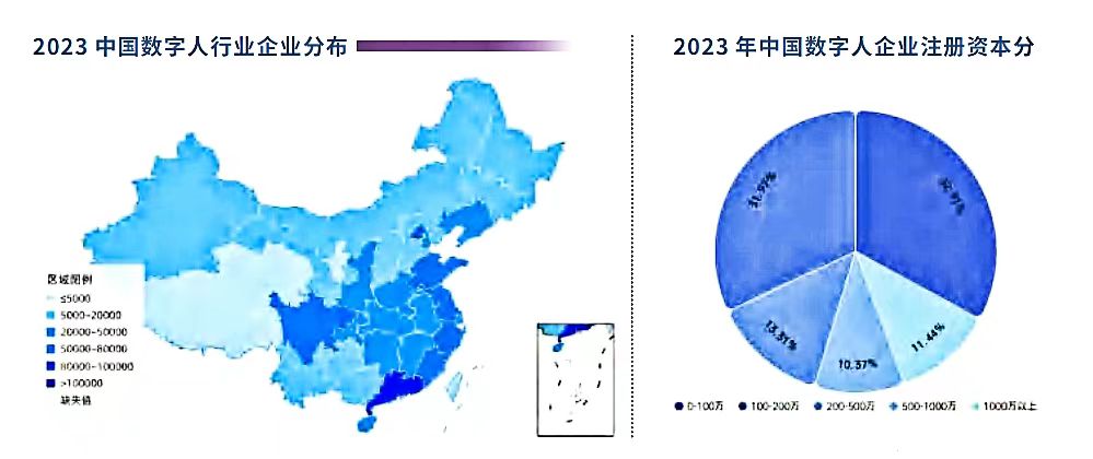 天眼查為《報告》提供的數(shù)據(jù)顯示:2023 年度“數(shù)字人、虛擬人”相關(guān)企業(yè)99.3 萬余家,其中,2023 年1 月-12月新增相關(guān)企業(yè)41.7 萬余家,與2022 年同比上漲42.3%。從地域分布來看,廣東、浙江、山東(浙江與山東并列),三地相關(guān)企業(yè)位居前列,分別擁有12.3 萬余家、7.6 萬余家;江蘇、福建,分別以6.7 萬余家、5.7 萬余家緊隨其后。