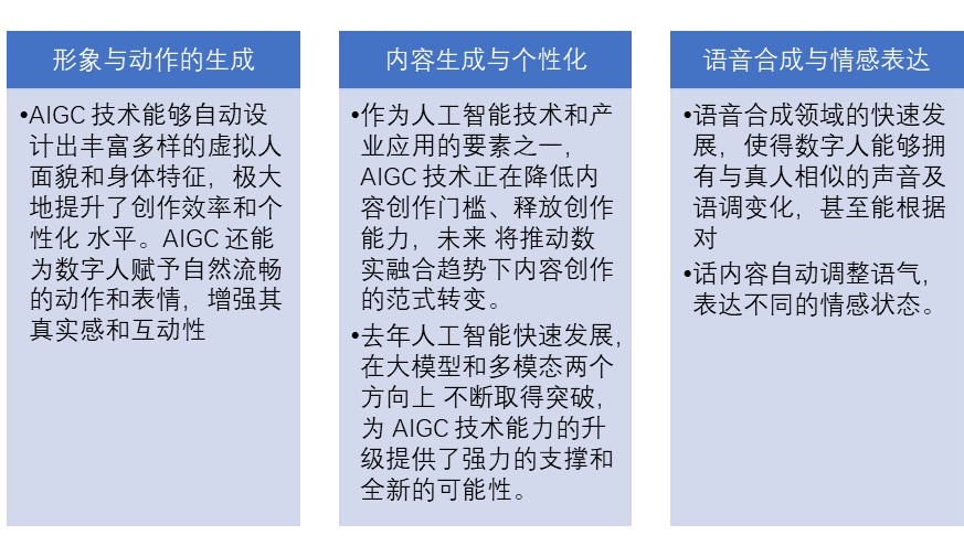 在2023 年一年之內(nèi),AIGC 經(jīng)歷了三波浪潮。第一波是以GPT 為代表的大模型的出現(xiàn),第二波是應(yīng)用層的快速創(chuàng)新,使智能化從Chat 向Work 轉(zhuǎn)化,第三波則是深度業(yè)務(wù)場景的應(yīng)用,打通業(yè)務(wù)數(shù)字化全流程,服務(wù)實(shí)體經(jīng)濟(jì)。 在數(shù)字人行業(yè),2023 年AIGC 技術(shù)的發(fā)展引發(fā)了創(chuàng)作新范式,推動了面部和身體的生成、語音合成、情感表達(dá)等 多個(gè)方面的變革,促進(jìn)了數(shù)字人角色生成效能、內(nèi)容生成效能、多模態(tài)互動能力等。