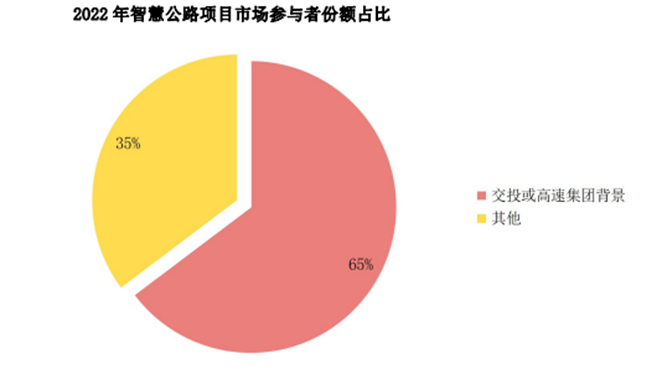 智慧公路市場參與者包括交投或高速集團背景的系統(tǒng)集成商、非交投或高速集團背景系統(tǒng)集成商、互聯(lián)網(wǎng)科技公司、產(chǎn)品商等。 根據(jù)市場調(diào)研報告統(tǒng)計,智慧公路多數(shù)項目由交投或高速集團背景的系統(tǒng)集成 商中標,2022 年中標的項目金額約22 億元,占整體智慧公路項目市場投資規(guī)模 的65%,智慧公路建設(shè)市場內(nèi)循環(huán)現(xiàn)象突出。