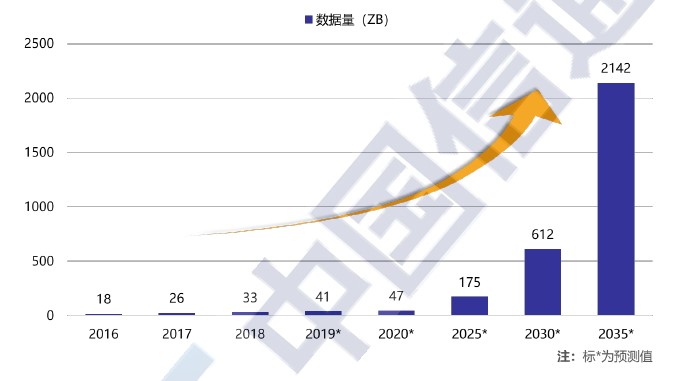 當(dāng)前,全球數(shù)據(jù)量仍在飛速增長的階段。根據(jù)北京研精畢智市場(chǎng)調(diào)研網(wǎng)的統(tǒng)計(jì)和預(yù)測(cè),2020 年全球數(shù)據(jù)產(chǎn)生量預(yù)計(jì)達(dá)到47ZB,而到2035 年,這一數(shù)字將達(dá)到2142ZB,全球數(shù)據(jù)量即將迎來更大規(guī)模的爆發(fā)。