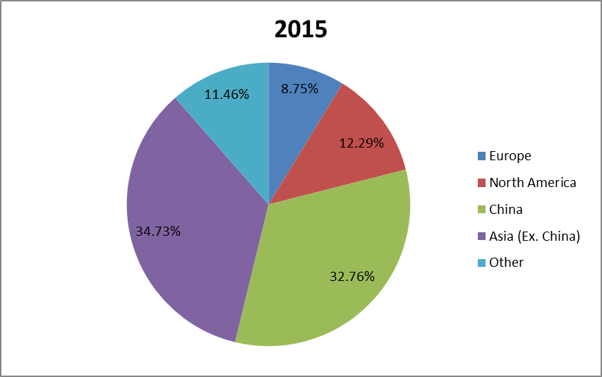 2.中國(guó)制造技術(shù)發(fā)達(dá),勞動(dòng)力成本低,是最大的供應(yīng)商,2015年生產(chǎn)市場(chǎng)份額超過(guò)32%,亞洲其他地區(qū)在全球的市場(chǎng)份額也超過(guò)34%。