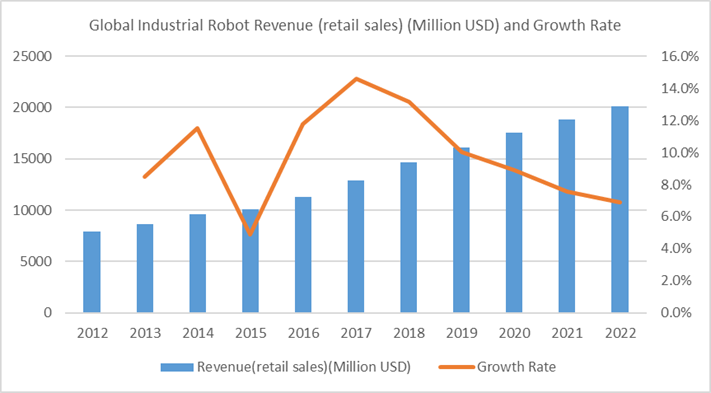 圖:2012-2022年中國工業(yè)機(jī)器人收入(百萬美元)和增長率