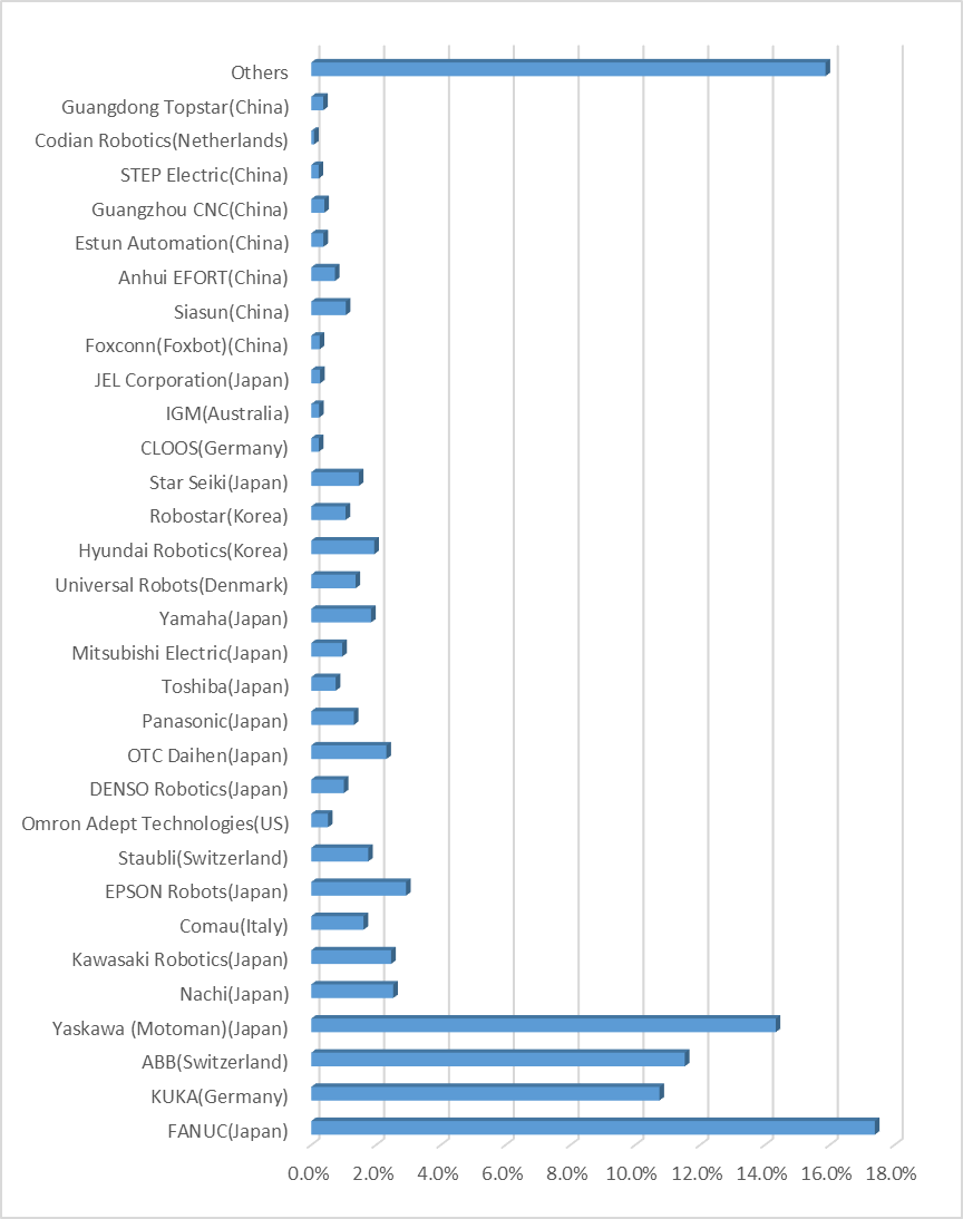 圖:2016年全球工業(yè)機(jī)器人收入市場份額(%)(按制造商)