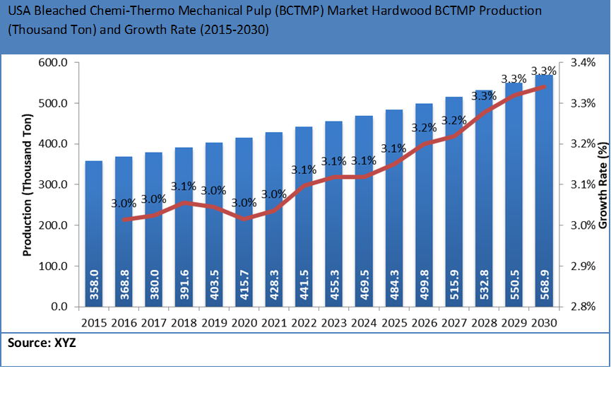圖美國漂白化學-熱機械漿(BCTMP)市場硬木BCTMP產(chǎn)量(千噸)和增長率(2015-2030年)
