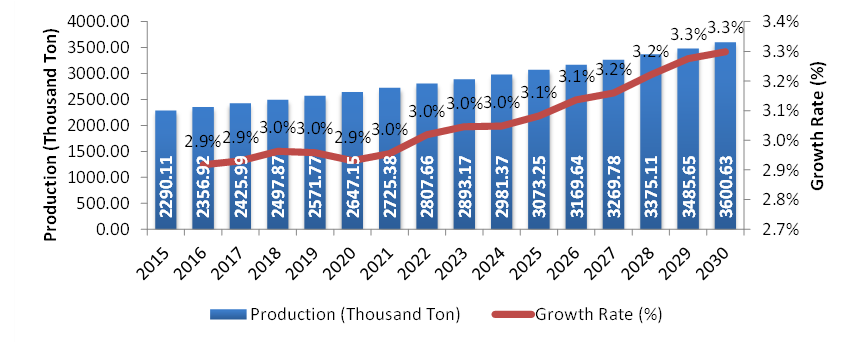 圖歐洲漂白化學-熱機械漿(BCTMP)市場硬木BCTMP產(chǎn)量(千噸)和增長率(2015-2030年)