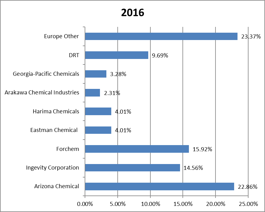 圖:2016年歐洲松樹(shù)衍生化學(xué)品收入份額(%)(按廠商)