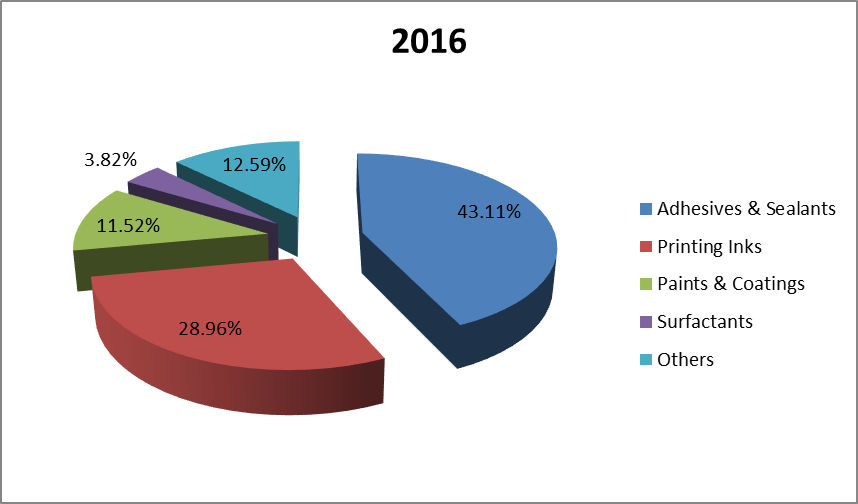 2.從松樹(shù)及其部位提取的化學(xué)物質(zhì)是自然產(chǎn)生的。因此,松樹(shù)是一種可再生的化學(xué)品來(lái)源,可在各種行業(yè)中應(yīng)用。傳統(tǒng)上,這些松樹(shù)衍生的化學(xué)品被用于粘合劑行業(yè)、建筑行業(yè)和醫(yī)療保健行業(yè)等。最近,這些松樹(shù)衍生的化學(xué)品已被用于粘合劑和密封劑、印刷油墨、油漆和涂料以及表面活性劑等領(lǐng)域。粘合劑、密封劑和印刷油墨是兩個(gè)主要應(yīng)用領(lǐng)域。