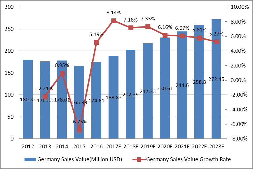 圖:德國(guó)松樹(shù)衍生化學(xué)品市場(chǎng)收入(百萬(wàn)美元)和增長(zhǎng)率(2012-2023)