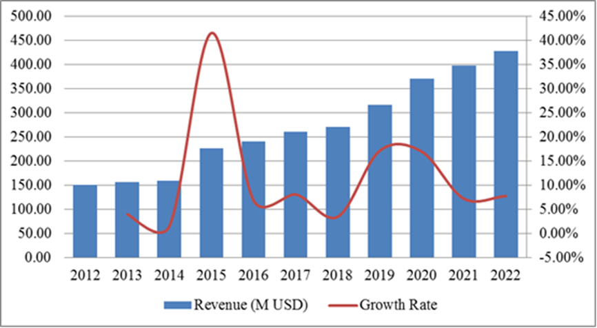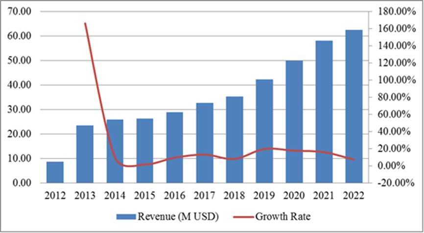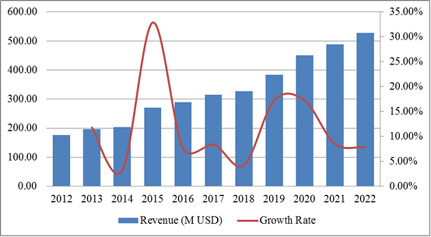 圖:2012-2022年亞太地區(qū)反向自動(dòng)售貨機(jī)收入(百萬美元)和增長率