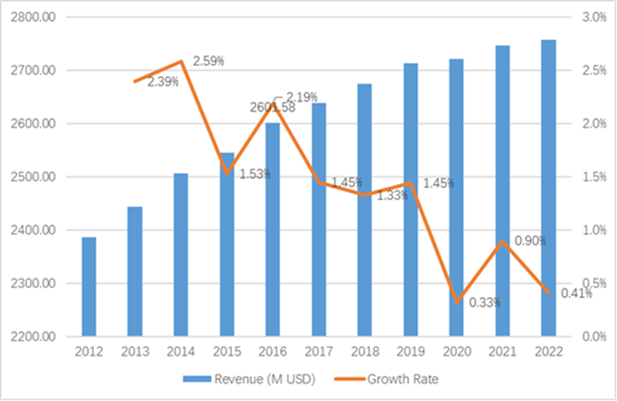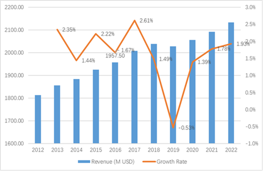 圖:歐洲模板業(yè)營收(百萬美元)和增長率(2012-2022年)