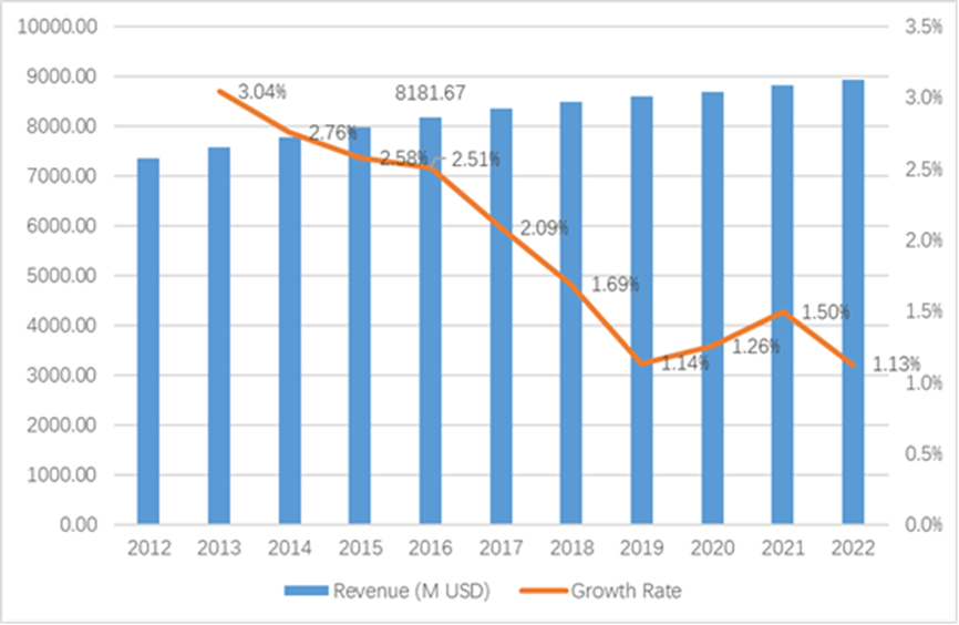 圖:北美模板業(yè)收入(百萬美元)和增長率(2012-2022年)