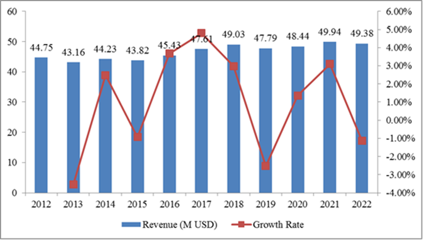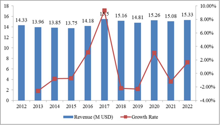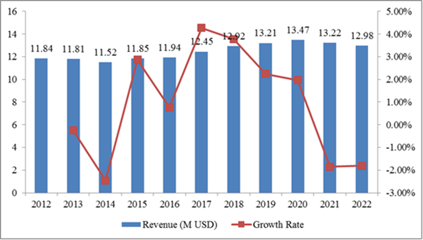 圖:2012-2022年亞太奮乃靜收入(百萬美元)和增長率