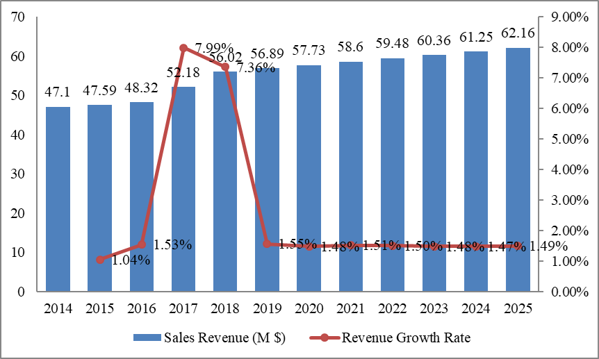 圖:法國導管穩(wěn)定裝置營收(百萬美元)和增長率(2014-2025年)