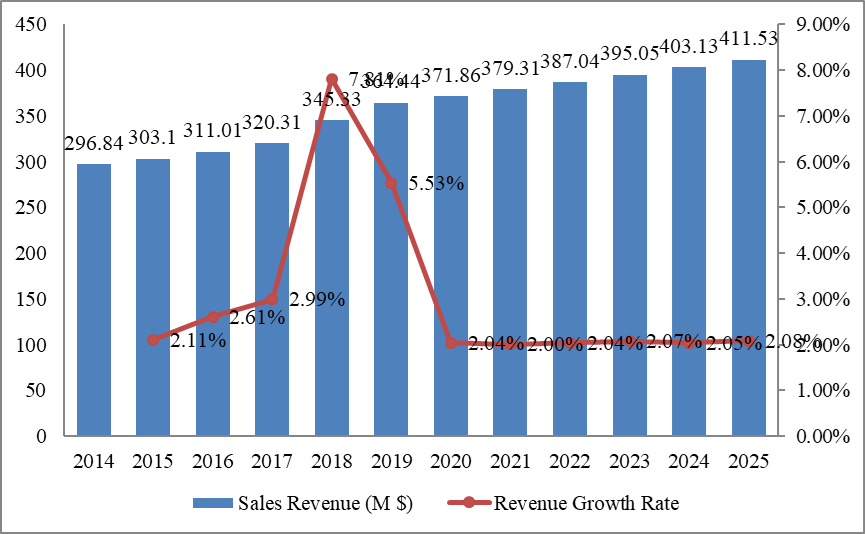 圖:英國導管穩(wěn)定裝置收入(百萬美元)和增長率(2014-2025年)